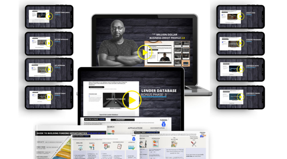 Complete Personal and Business Tradeline 12 Step Module to Build Over $50k in Net Accounts in 90 Days! My Unique Vendor Database I Use to Create $15k in Monthly Revenue Like Clock Work!  Simple A to Z Strategy to Access More then $250k in Funding in 45 Days The all new Million Dollar Business Credit Profile 2.0" Program Lifetime Access to the MILLION DOLLAR BUSINESS CREDIT PROFILE 2.0 Program - ($2997.00 Value) Lifetime Access to the Bonus Phase 1,2,3 Corporate Auto, Travel And Lender Database - ($297.00 Value) Lifetime Access to the Credit Referral invite Only Business - ($197.00 Value) Lifetime Access to the Do it Yourself Credit Repair Letter System - ($297.00 Value)